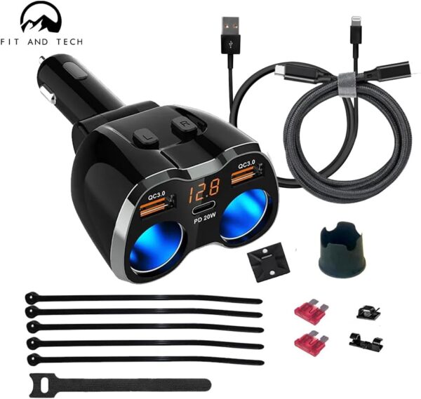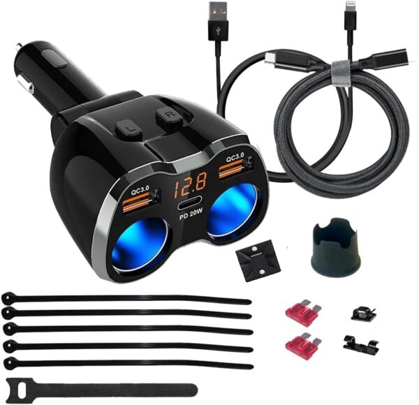 3 Self Adhesive Cliop holders, 5 cable ties, 1 Velcro tie, C46 Dual Socket 5 outlet Charger with Anti-Slip Rubber and 2x 10 Amp Fuses, USB to USB-c x 5ft Charging wire / USB to iPhone Lightning x 5ft Charging wire3 Self Adhesive Cliop holders, 5 cable ties, 1 Velcro tie, C46 Dual Socket 5 outlet Charger with Anti-Slip Rubber and 2x 10 Amp Fuses, USB to USB-c x 5ft Charging wire / USB to iPhone Lightnin… See more |